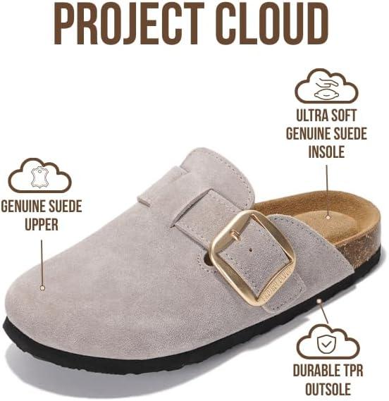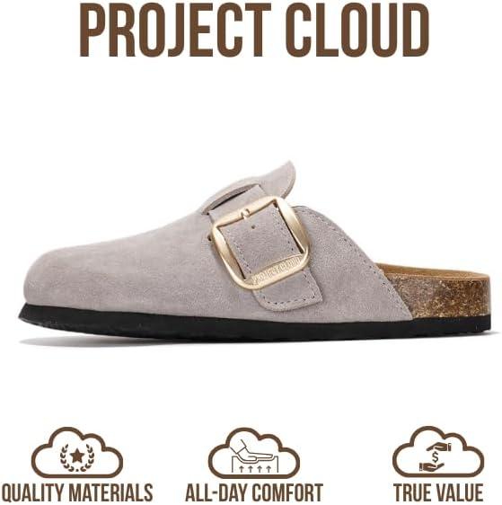 Project Cloud 100% Genuine Leather Clogs for Women Shoes – Memory Foam Insole, Non-Slip & Natural Cork Footbed Arch Support Big Buckle Womens Clogs and Mules Footwear (Manchester)(Grey)