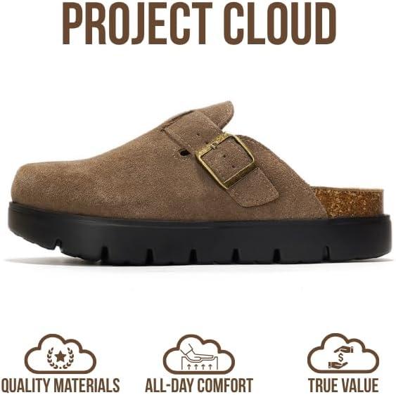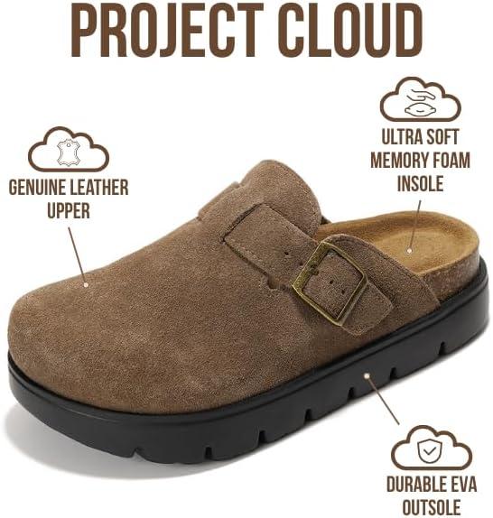 Project Cloud 100% Genuine Leather Platform Clogs for Women Footwear – Memory Foam Arch Support Cork Footbed Casual Shoes & Mules for Women 2025 (Benton Chunky)(Foss Suede)
