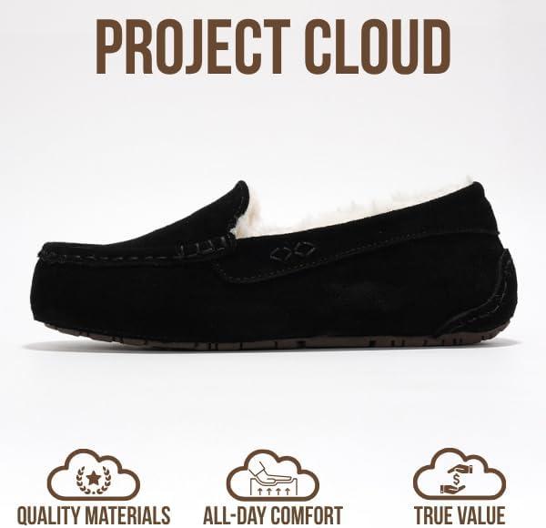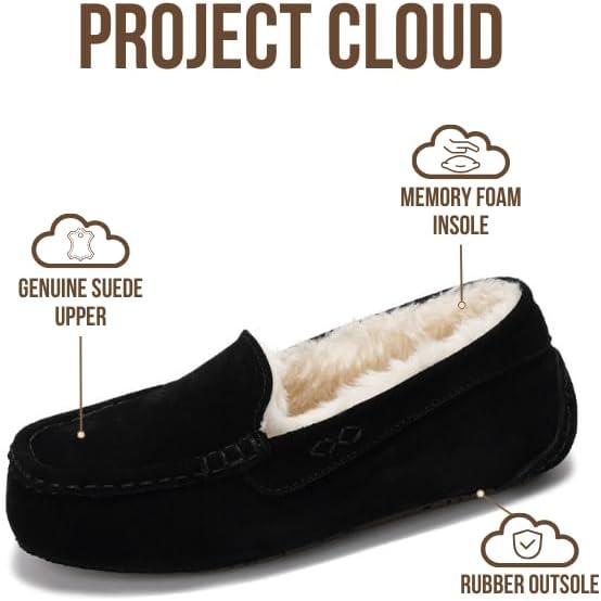 Project Cloud 100% Genuine Leather Slippers for Women – Fur Lined Outdoor Slippers for Women Footwear with Memory Foam – Stylish Womens Moccasin (Cathi)(Black)