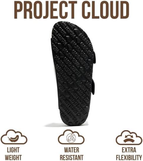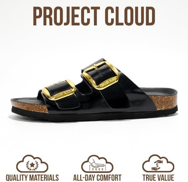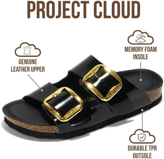 Project Cloud Genuine Leather Flat Sandals for Women 2025 Comfortable Beach Essentials Womens Sandals Memory Foam Vacation Essentials Slides for Women Footwear (Santorini)(Black Patent)