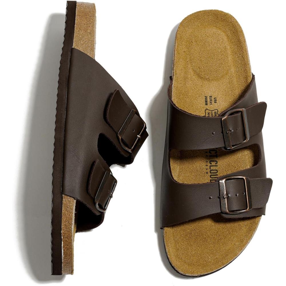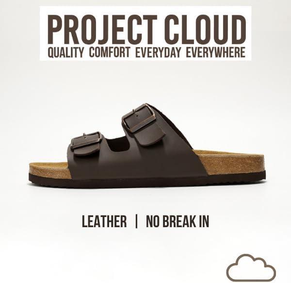 Project Cloud Genuine Leather Mens Sandals with Memory Foam Natural Cork Footbed Slides for Men Footwear – Non-Slip Double-Strap Buckle Summer Sandals (Arizona)(Brown Leather)