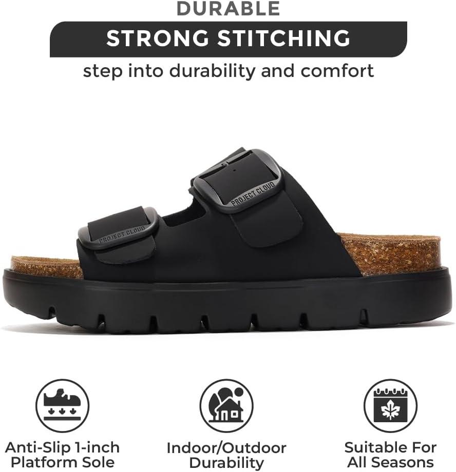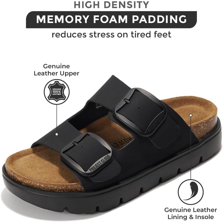 Project Cloud Genuine Leather Platform Sandals Women Footwear – Wedge Chunky Sandals Womens sandals with Memory Foam Insole and Cork Footbed (GREECECHUNKY)(Black Monochrome)