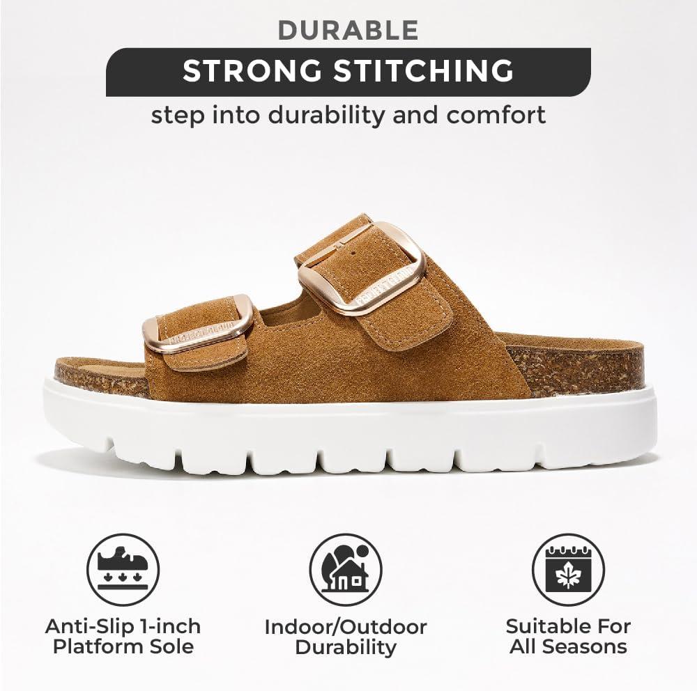 Project Cloud Genuine Leather Platform Sandals Women Footwear – Wedge Chunky Sandals Womens sandals with Memory Foam Insole and Cork Footbed (GREECECHUNKY)(Tan)