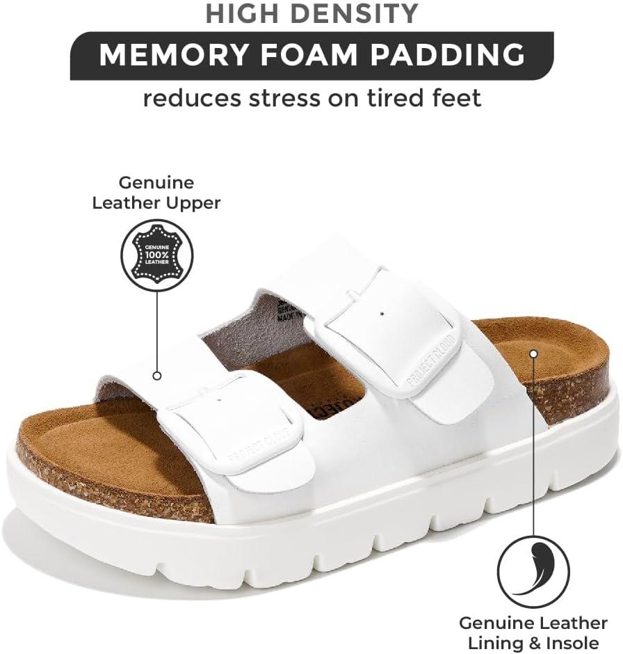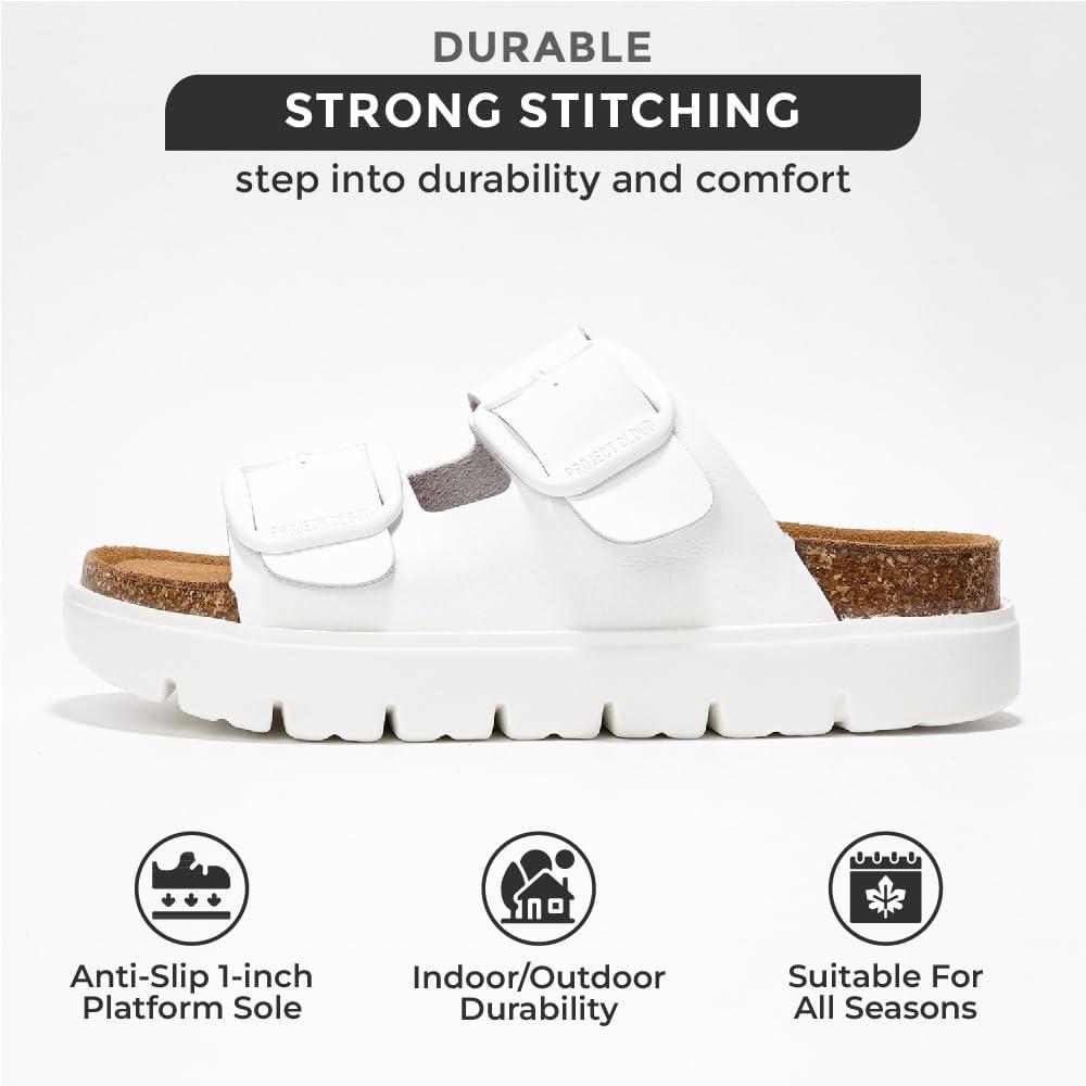 Project Cloud Genuine Leather Platform Sandals Women Footwear – Wedge Chunky Sandals Womens sandals with Memory Foam Insole and Cork Footbed (GREECECHUNKY)(White)