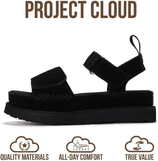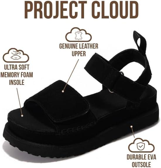 Project Cloud Genuine Leather Platform Sandals Women – Memory Foam Insole Slip Resistant Chunky Womens Sandals with adjustable straps – Stylish Women Footwear (Bronzestar)(Black Suede)
