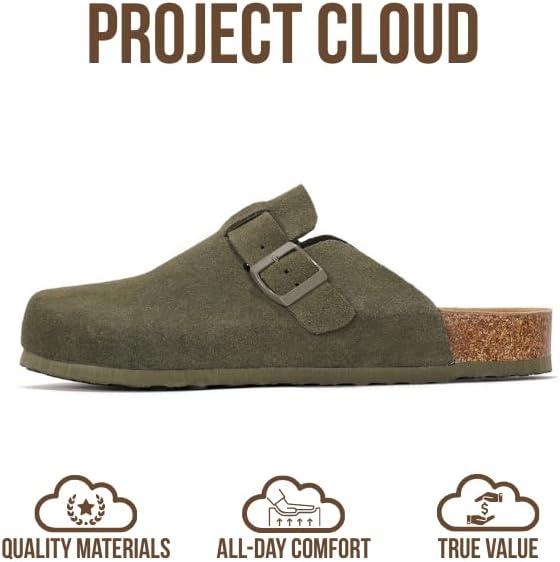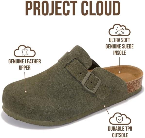 Project Cloud Mens Clogs – 100% Full Grain Genuine Leather Memory Foam Clogs for Men Arch Support Cork Footbed – Non Slip Platform Mules (Brooklyn)(Olive Suede)