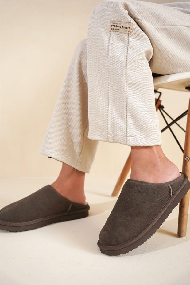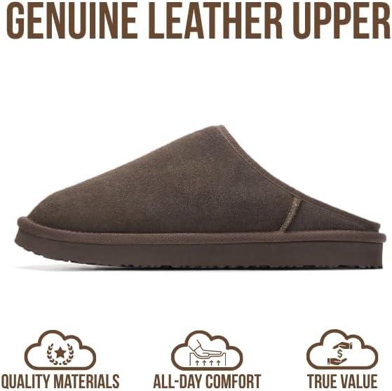 Project Cloud Mens Slippers 100% Genuine Leather and Genuine Shearling Lining – House Slippers for Men with Memory Foam Insole – Lightweight & Non Slip Mens House Shoes (Chill)(Choco Brown Suede)