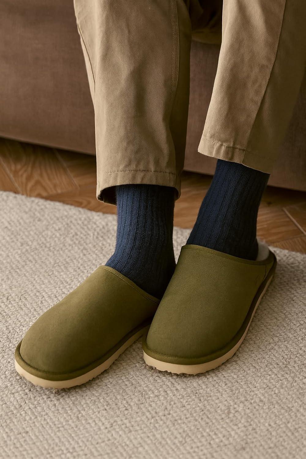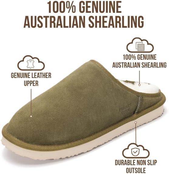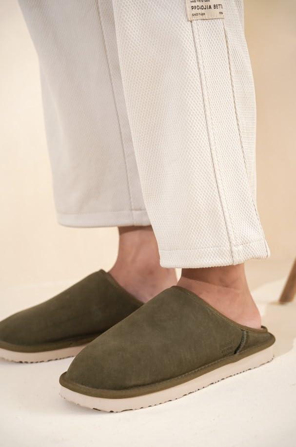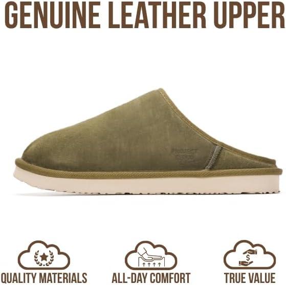 Project Cloud Mens Slippers 100% Genuine Leather and Genuine Shearling Lining – House Slippers for Men with Memory Foam Insole – Lightweight & Non Slip Mens House Shoes (Chill)(Olive Suede)