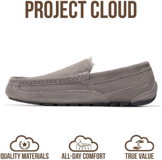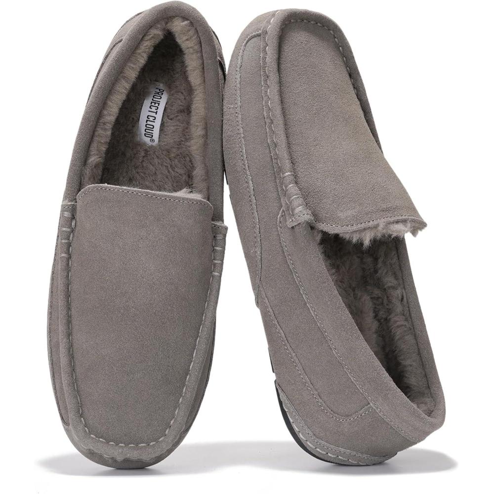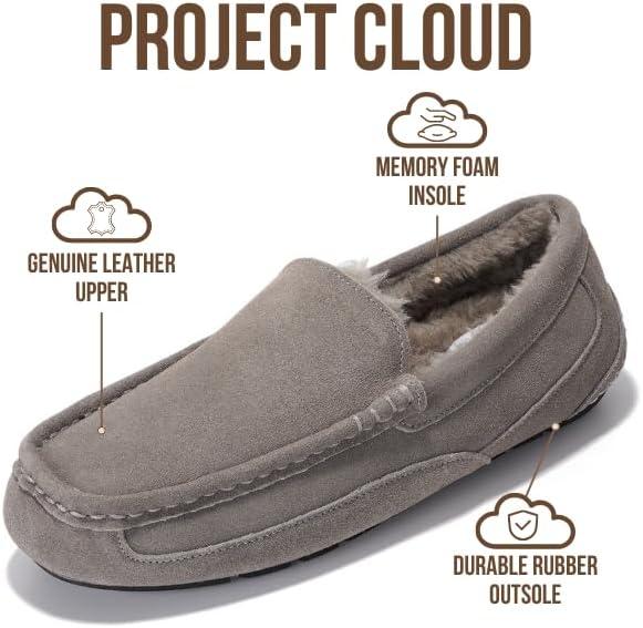 Project Cloud Mens Slippers 100% Genuine Leather with Memory Foam Insole Mens Shoes – Non-Slip and Lightweight Indoor and Outdoor Slippers for Men (Oswin)(Grey Suede)