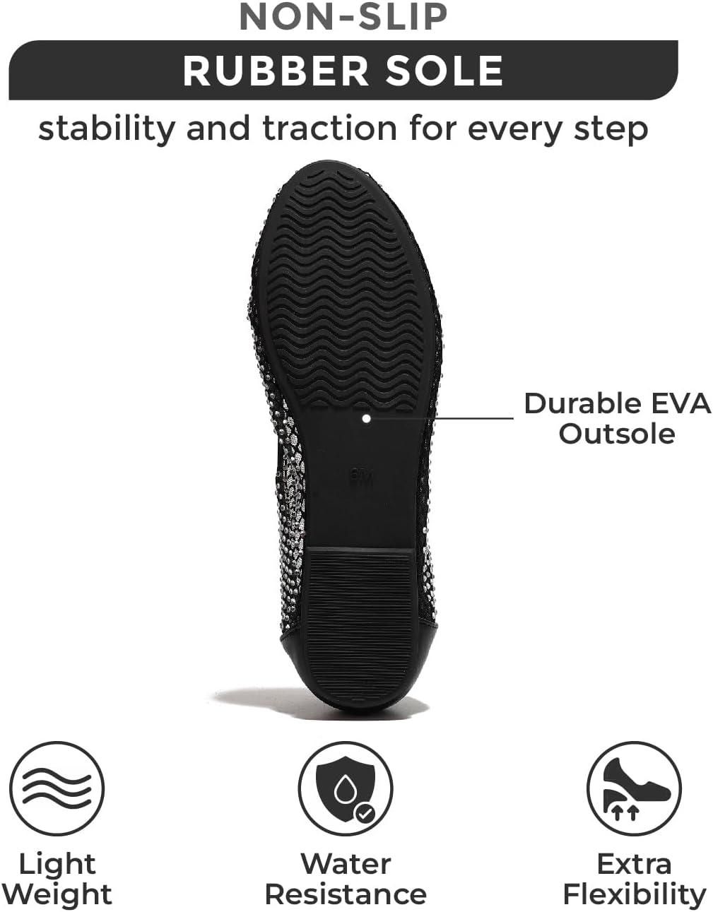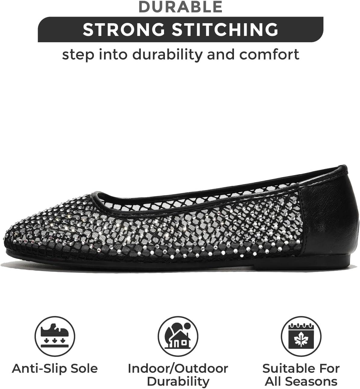 Introducing the Cloud Ruthie Mesh ballet shoes for women, where elegance meets unparalleled comfort. These versatile ballet flats are crafted to elevate your style while providing the utmost comfort and support, making them an essential addition to your footwear collection. Designed with a high-quality memory foam insole, these flats shoes women dressy comfortable offer exceptional comfort by molding to the unique contours of your feet. This personalized cushioning ensures that whether you're on your feet all day at work or enjoying a casual outing, your feet will feel pampered and fatigue-free making it an ideal office shoes for women. The durable rubber outsole is non-slip, providing reliable traction on various surfaces. Walk confidently on wet floors or uneven pavement, knowing that your steps are secure and stable. No more fussing with laces or buckles; simply slip your feet into these flats and you're ready to go. Perfect for the woman on the move, these sparkly sandals & shoes offer ease and efficiency without compromising on style. Made from premium materials, the Cloud Ruthie Mesh Flats are built to last. Their flexible construction allows for easy folding, making them a perfect travel companion. Pack them in your bag without worrying about them losing their shape, and enjoy comfort and style wherever your adventures take you. These flat shoes aren't just about comfort—they also feature a chic, stylish design that enhances any outfit that is a perfect womens shoes summer that is available with colors black & nude flats. The elegant mesh upper adds a touch of sophistication, while the variety of available colors allows you to express your personal style. From office wear to casual outings, these breathable shoes for women are versatile enough to complement any look.